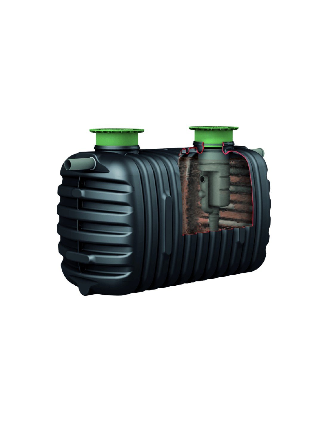 Fosa séptica con filtro biológico diseñada para el almacenamiento y tratamiento de aguas residuales de una forma eficiente y responsable fabricada en polietileno de alta densidad por extrusión-soplado en una sola pieza, lo que mejora su resistencia mecánica y evita fugas.